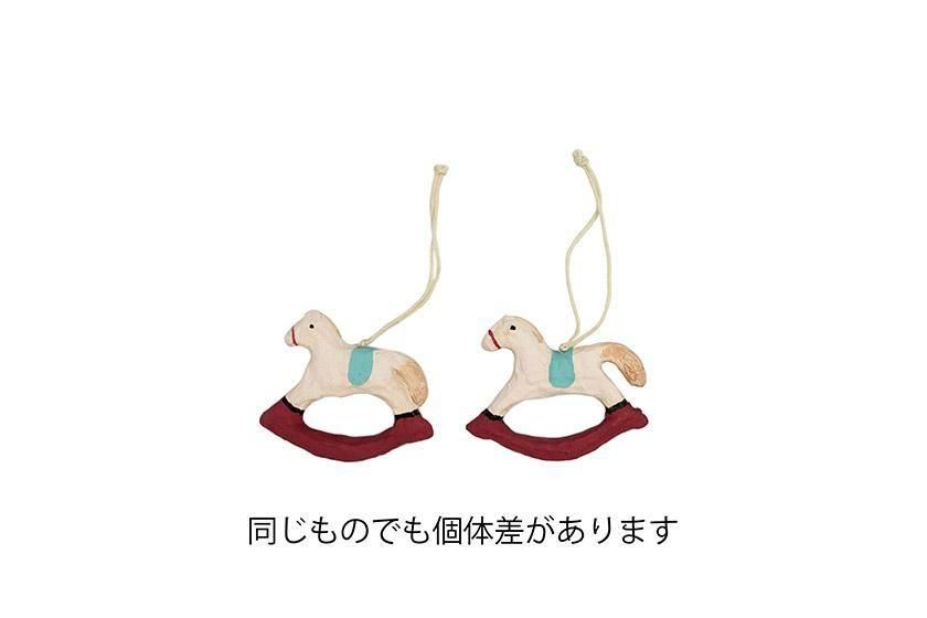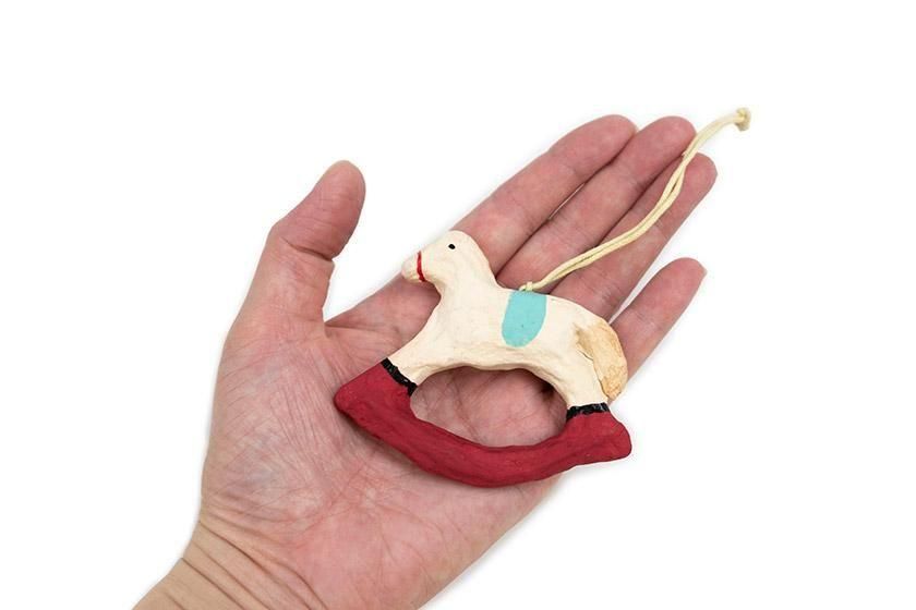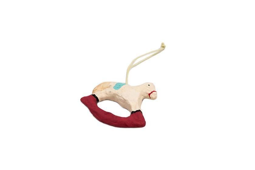 インド北部、カシミール地方伝統の紙細工ペーパーマッシュで作られたホリデーオーナメント 木馬です